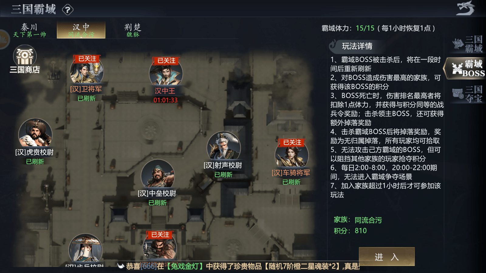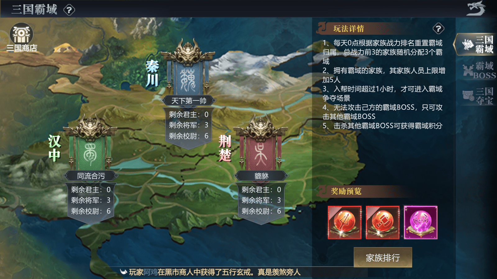 每天凌晨0点,根据家族战力排名,对霸域归属进行重置。总战力前三的家族将随机分配3个霸域。