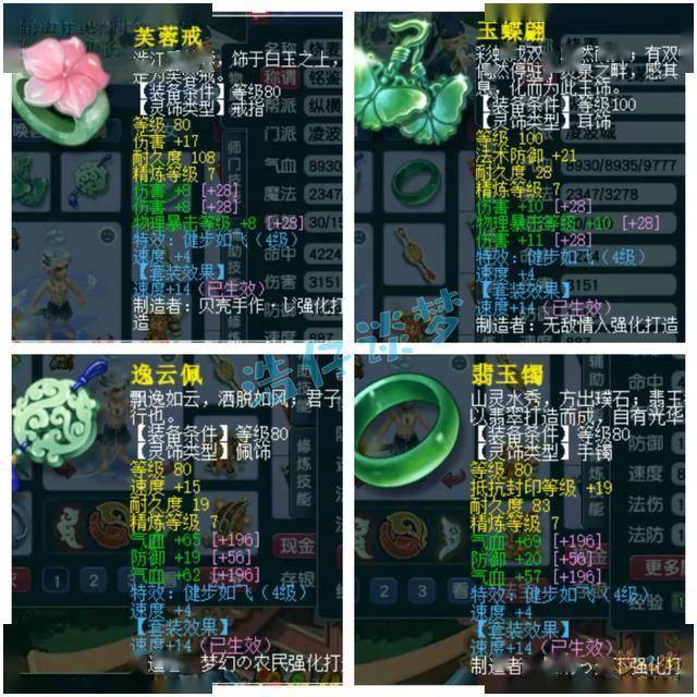 戒指和耳饰下排都是双伤害一物暴,配饰和手镯下排都是双气血一防御,全部打了7锻星辉石,特效都是4级健步如飞。