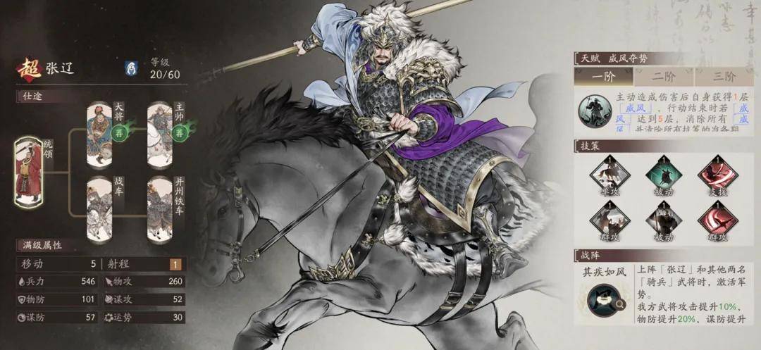 外加我们在开局阶段不少能获得与培养的角色都属于骑兵,例如关于、夏侯惇等等(大家不要觉得骑马的就都是骑兵哈,这个不见得......),所以逻辑上来讲张辽的这个军势也是相对最能匹配于我们开局后发展的一个军势,最后再考虑到张辽自身也拥有不错的强度,维一会将其评级到T0-T1左右的一个强度,所以无疑张辽这位角色也是这三位中现阶段价值相对比较出彩的一位,大家可以参考参考。
