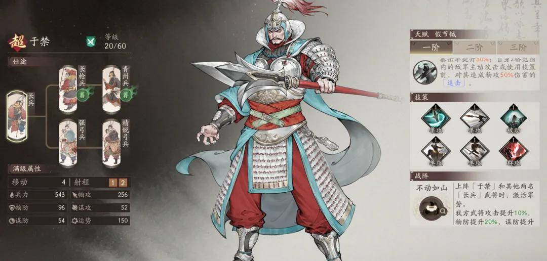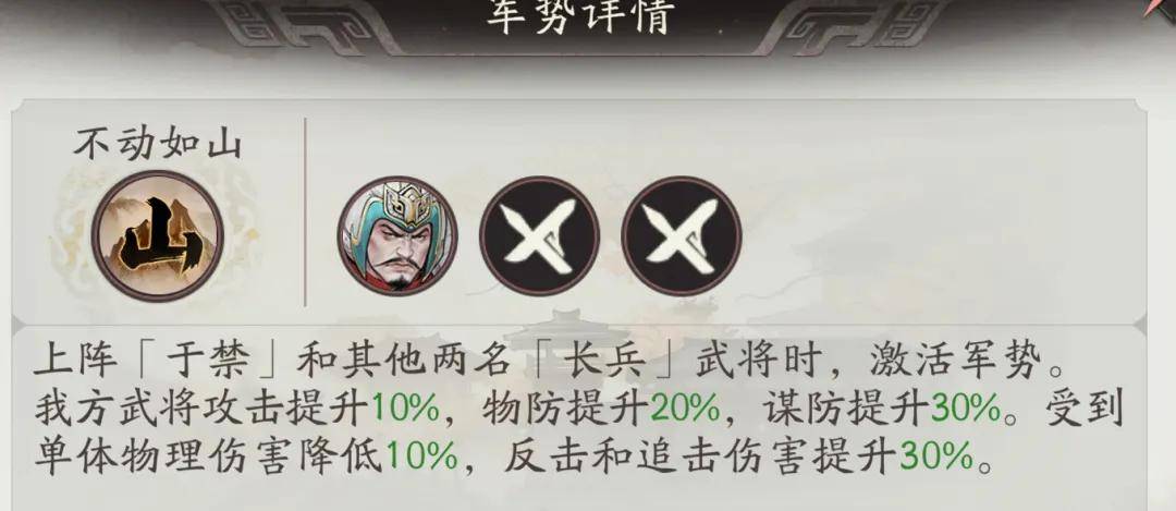 第二位则是对应长兵队的于禁,而他的军势需要额外上两位长兵才能激活,当然游戏里的步兵也分为长兵和短兵等,大家也需要点开他们的兵种才能具体确认是个什么系别......