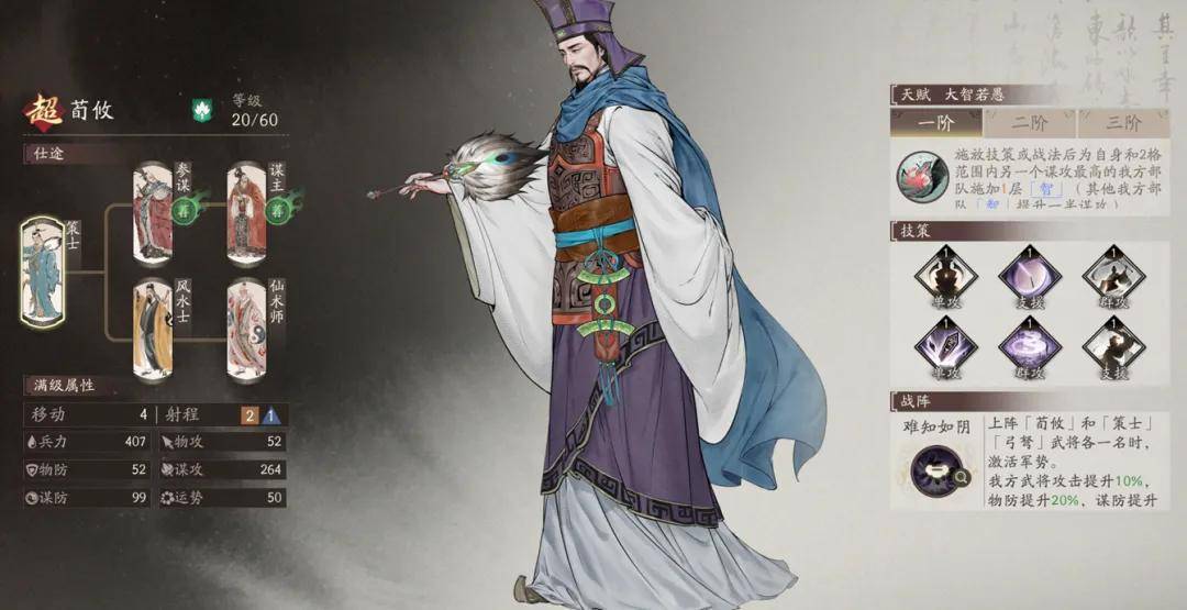 第三位则是曹操真正的谋主荀攸,这位也自带了谋士类别的军势,那么谋士在这个游戏中的地位其实并不低,在大家扛得住的前提下甚至可以达到很高的程度,但如何才能扛得住......这也是困扰谋士玩家们的一个巨大难题,当然这个难题很有可能会在刘备具备开启后得到解决......(因为张飞)