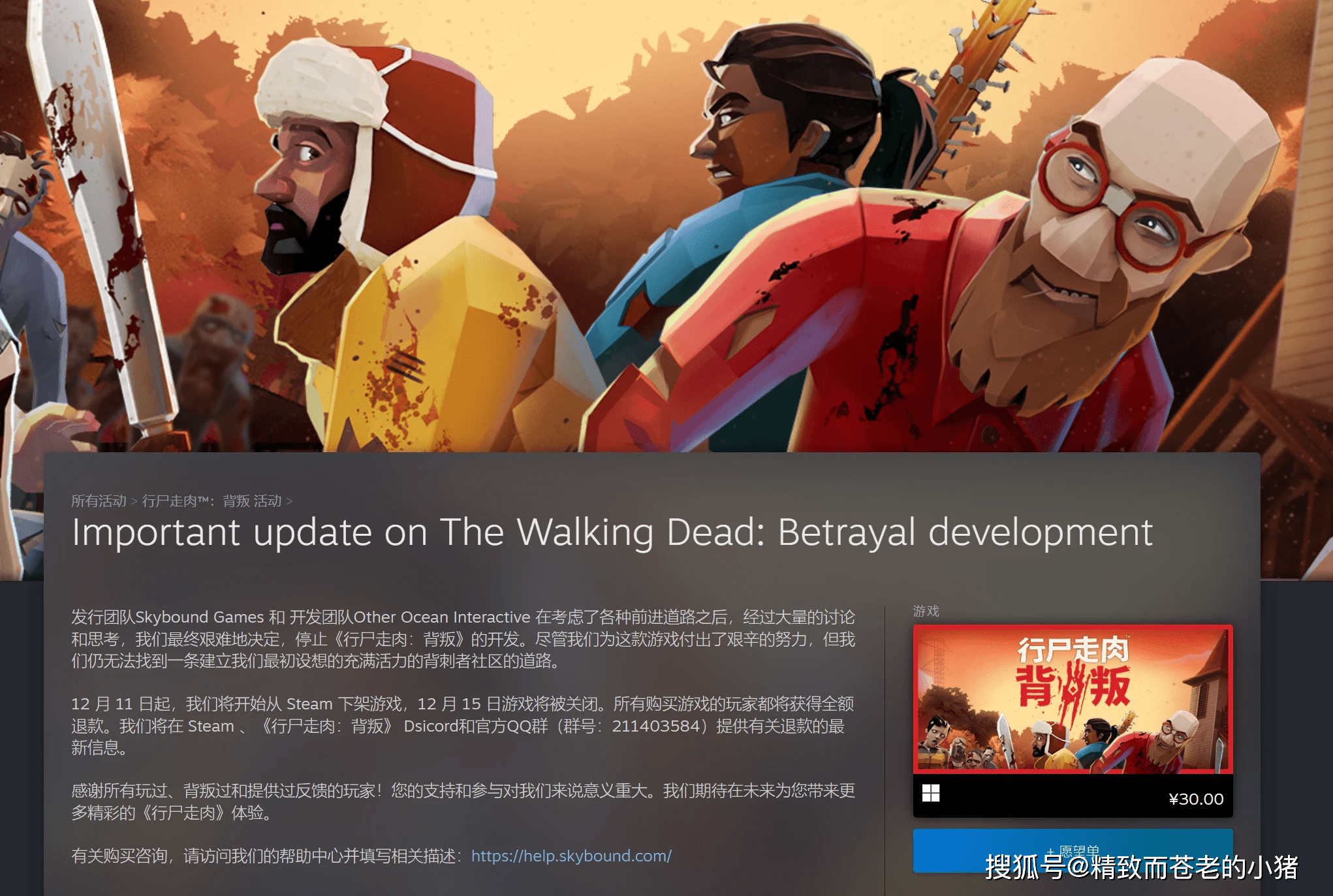 考虑到玩家数不足,发行商 Skybound 与 Other Ocean Interactive 在上周 12 月 8 日做出艰难的决定,让《行尸走肉:背叛》在 12 月 11 日从 Steam 商店下架,并在 12 月 15 日永久关闭,同时,公告强调所有购买了游戏的玩家都将能获得全额退款。