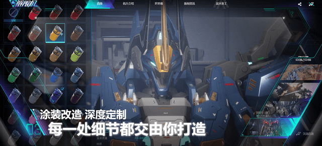 与此同时,机甲在格纳库中也有很多玩法,就比如涂装的自定义功能,不仅可以对机甲整体进行颜色、光泽度以及磨损程度进行调整,这样就能制作出专属于你自己的机甲外观。