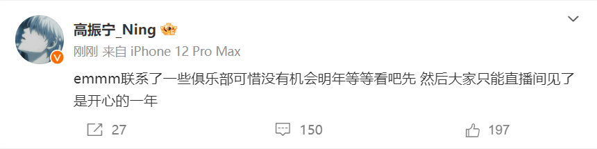首先是Ning的发文如下,他表示自己在转会期联系了一些俱乐部,但是很可惜没有什么机会,明年会继续等待,后面只能在直播间和粉丝们见面了,但是今年在UP的一年很开心。