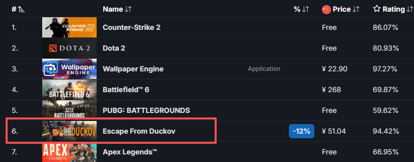 据SteamDB,《逃离鸭科夫》发售后的首个周末同时在线人数就突破20万,上周末已突破30万。该游戏同时在线人数已经超越了《Apex英雄》《三角洲行动》等热门PvP游戏,显示有着极高的热度。