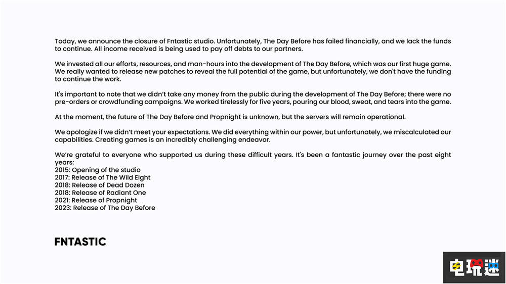 Fntastic发布的关闭公告称由于现在开发团队所收到的所有资金都被用于偿还合作伙伴,所以由于资金不足只能关闭工作室。他们为《浩劫前夕》投入了无数心血,也是Fntastic的第一款大型游戏。他们非常希望通过后续更新来展现游戏的全部潜力,但是不幸的是,他们没有足够的资金继续后续的开发工作。虽然游戏将停止更新,但是Fntastic称《浩劫前夕》与《Propnight》的服务器将保持正常运作。Fntastic对于没有达到玩家预期道歉,并且称团队错误估计了自己的能力与面对的挑战。