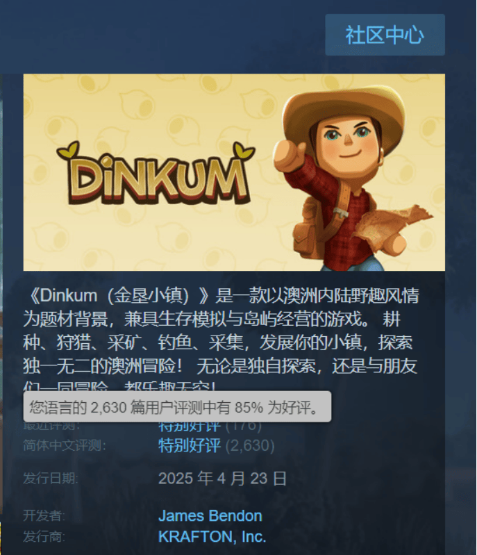 这是一款受澳大利亚内陆启发的生存、生活模拟游戏,由澳洲队里游戏开发者James Bendon一人打造,最初于2022年7月在Steam平台以抢先体验的方式推出——随后经过三年的优化和内容扩充,2025年4月游戏推出了正式版本。