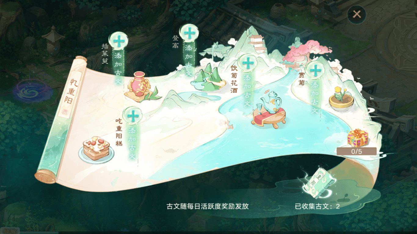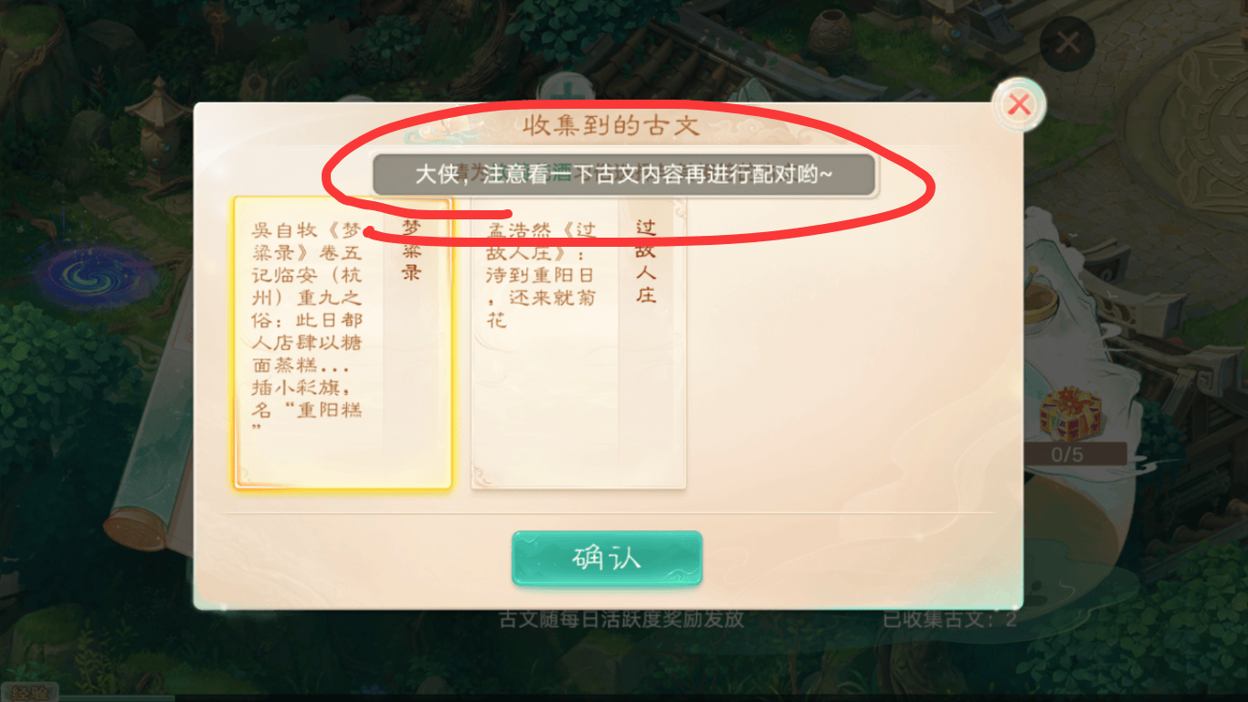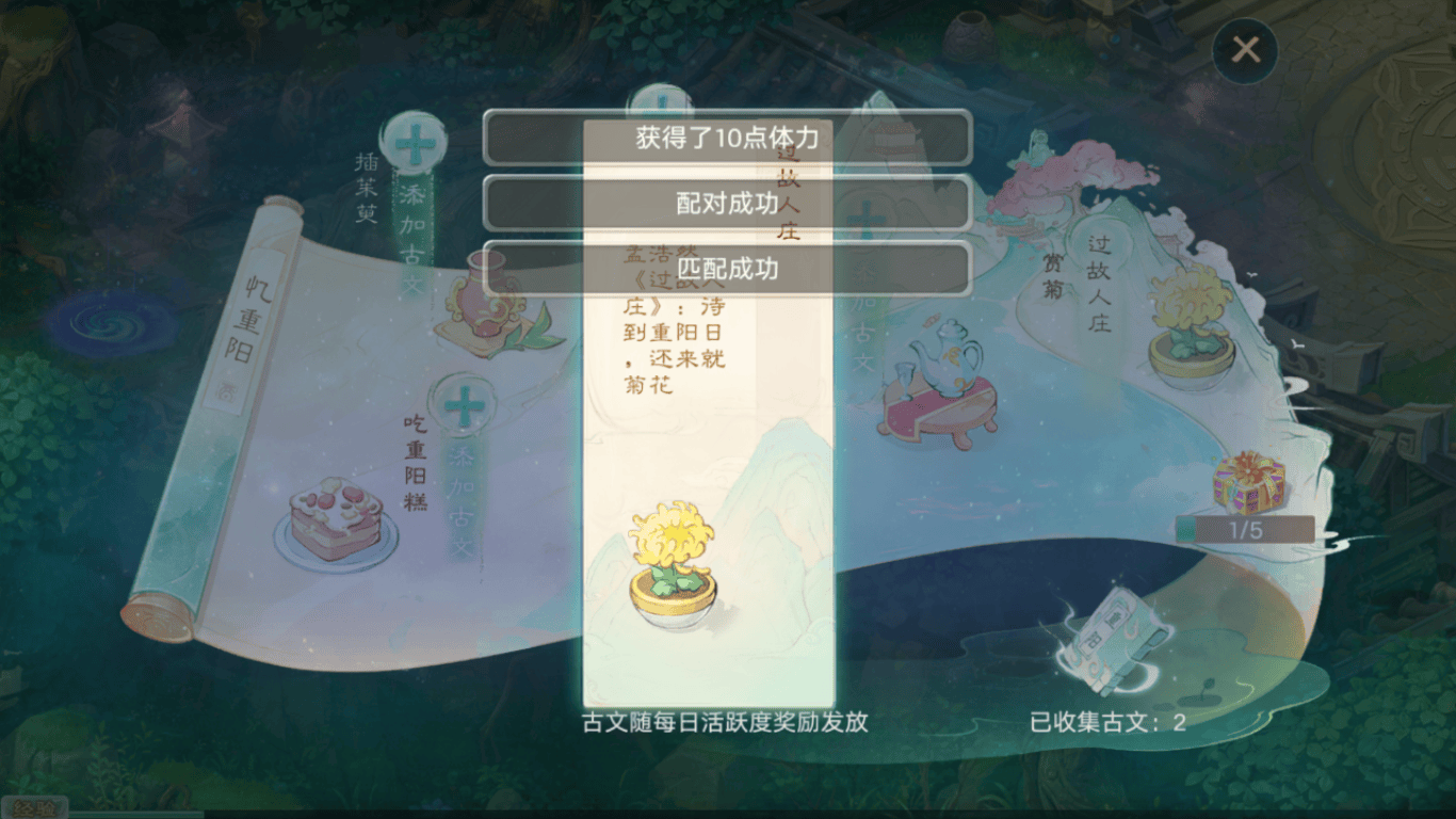 吟诗诵佳对是根据每日活跃度获得“古文”道具,然后匹配到相对应的习俗空位就可以了,这个是考察大家对于古文典籍中关于重阳节的记忆。
