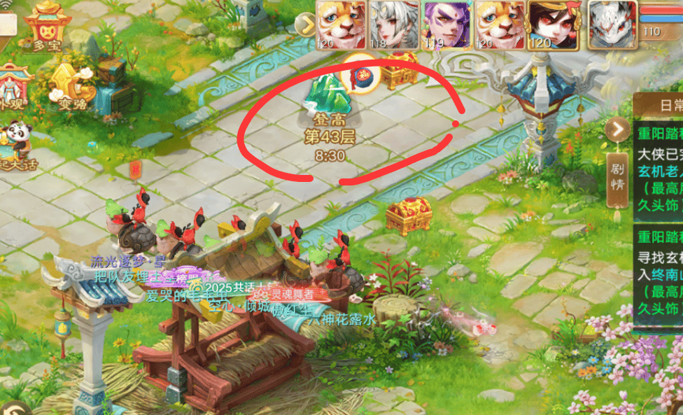 5的倍数层数(如5、10层)必触发战斗,实力较弱队伍,打不过用随机符跳整数关,可以跳5的倍数。优先拾取时光锦囊(延长时间)、千里眼(定位玄机老人)提升效率。