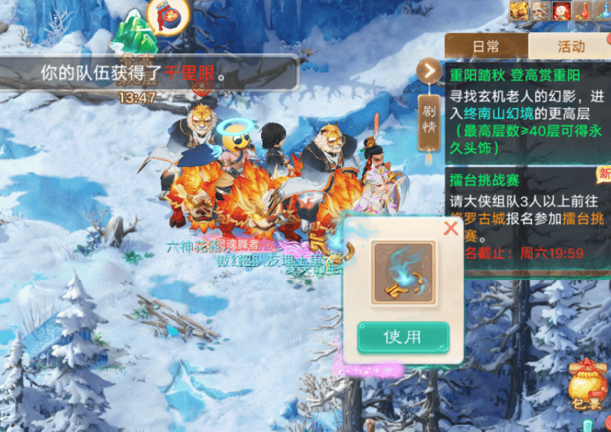 带队在终南山幻境登高,寻找玄机老人幻影答题或挑战,这个活动需要0转80级以上参加,3人以上组队,有时间限制,在15分钟内登高40层以上,最高60层。每一关都需要寻找玄机老人的幻影,最高层数≥40层可得永久头饰。