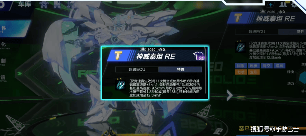 雷诺重工打造的神威泰坦 RE,是道具赛的 “控场大师”。使用导弹、酷比等道具时立刻获得小喷,配合 “小喷动力 + 20%” 的基础加成,能在释放干扰的同时完成冲刺。其 ECU 技能提供起步 150% 集气,让车手能抢先占据首个道具点,在团队赛中轻松建立前期优势。