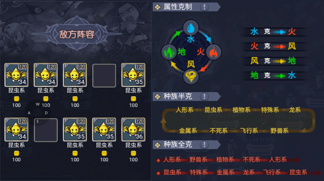 我们可以先点击“回合”旁边的“风地水火”图标,进入上图所示的界面。在这里,敌方阵容的属性看的一清二楚,以及了解哪种属性会被对方克制。当然,通常情况下,我们不需要使用这种方法,因为这样做会比较麻烦。只有在遇到强敌时才建议这样做,例如特别强的Boss。