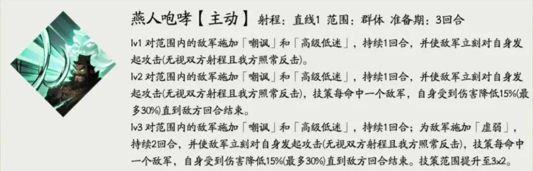 接着张飞会自带一个控制技能,而且这个还有范围控制与半输出两个特色,其中“嘲讽”控制的意义非常重要,对于后方角色的生存守护有很大的战略价值,此外这个技能在升阶后有自身减伤的能力,张飞本体就是一个还算不错的反伤盾,所以利用先攻等天赋能力,这个技能的伤害输出量也算是不错的。