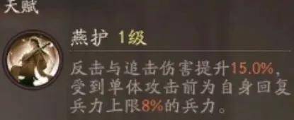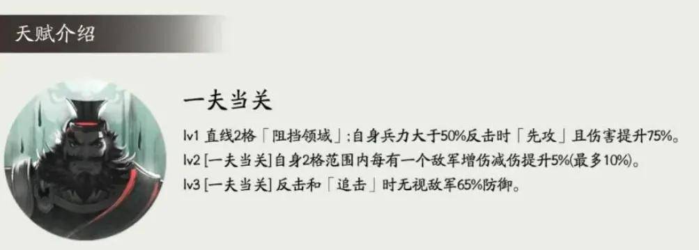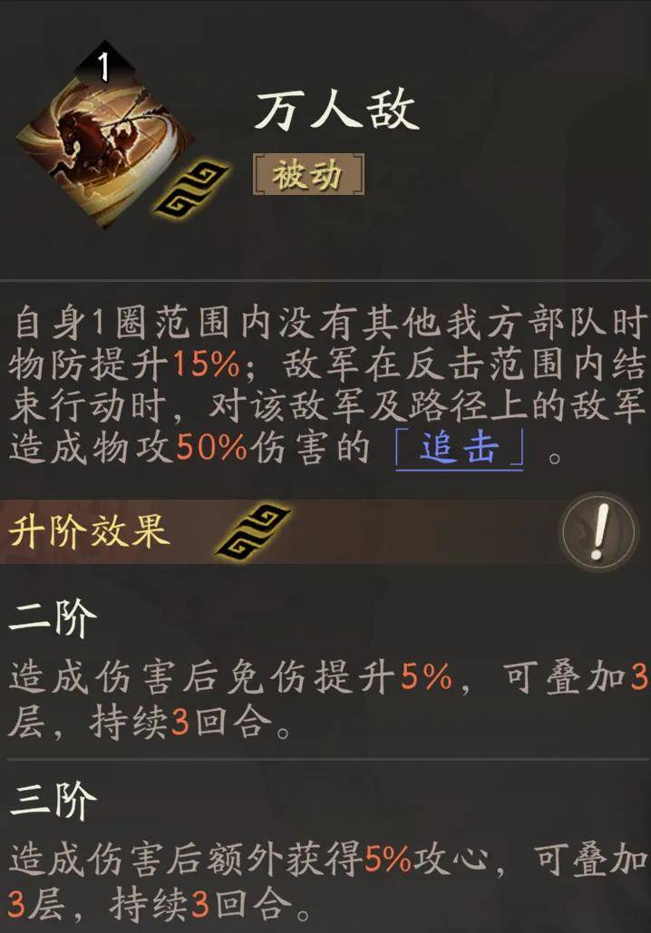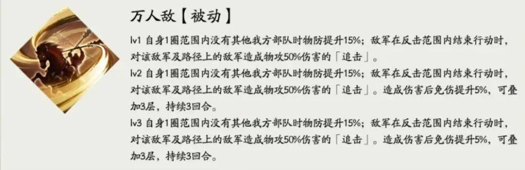 然后【万人敌】这个被动也是张飞的核心减伤与输出技能,其效果在张飞提升反击范围后就有很不错的体现了,不过官方在这里的技能介绍应该写错了,这个技能在3阶质变时还会有吸血的额外叠加,这个大家可以参考当前游戏中的张飞说明。