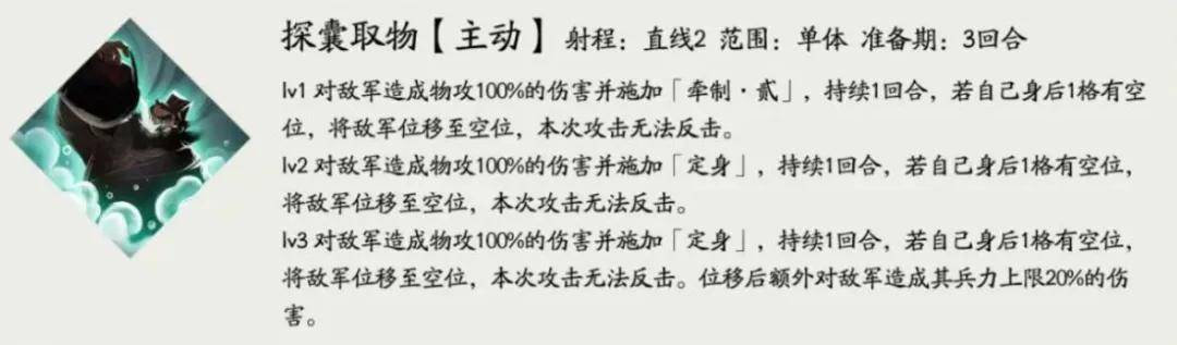 最后【探囊取物】这个技能则有定身+位移+固伤的特点,其输出能力在提升到3阶后非常可观,且敌方血量越高,关卡难度越难,则这个技能的伤害也越猛,不过由于张飞的另外两个专属技能的效果过于不俗,所以整体来讲在内测中,【探囊取物】这个技能携带的几率是要明显低于另外两个的。