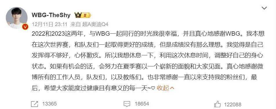 The Shy宣布的消息是这样的,他本以为可以和队友们一起拿到好成绩,但自己对世界赛的表现不满意,心怀愧疚决定休息一个赛季,调整好自己的身心状态,后续如果夏季赛状态好的会尽可能地以一个全新的面貌和大家见面。