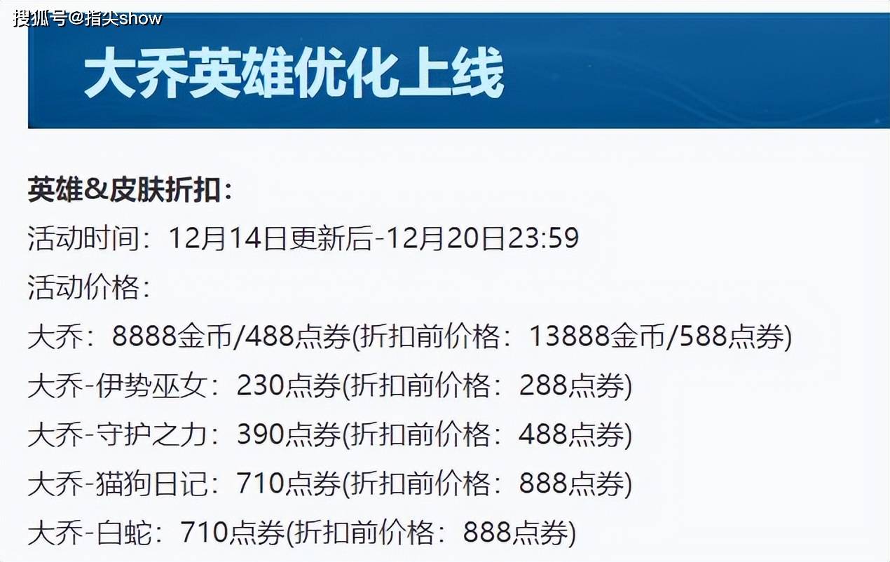 大乔因为专精装再次重做,所以英雄本身折扣,还对意识巫女、守护之力、 猫狗日记、白蛇这几款直售的皮肤进行折扣销售,有兴趣的小伙伴是可以入手的,猫狗日记和白蛇都是不错的皮肤,当然同为史诗,和白鹤梁神女还是有点差距。
