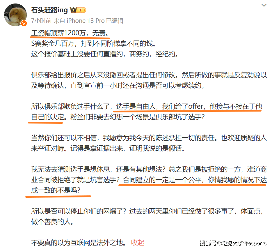 WBG老板在13号凌晨再度发文,解释了与Theshy续约的具体薪资,也就是前文提到的1200万。
