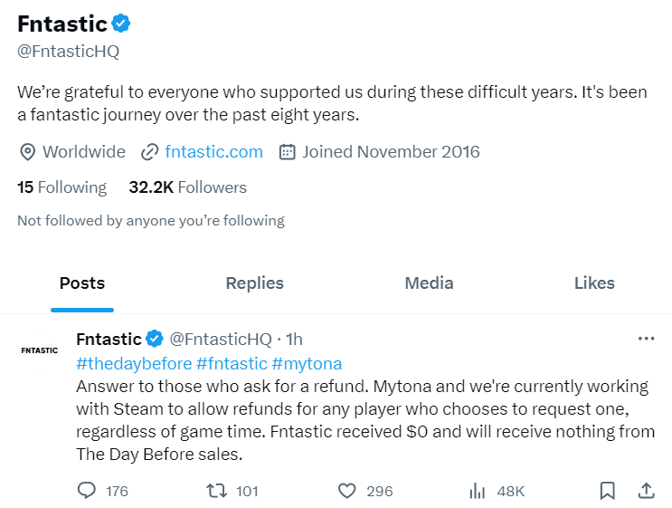 目前,Fntastic推特官号表示,正与《浩劫前夕》发行商Mytona积极与Steam方接洽玩家退款事宜,任何想要退款的玩家要求都会满足,而它在结尾还不忘补上:“Fntastic不会从《浩劫前夕》的销售中获得一刀乐”。这种“我才是受害者”的表达,也符合它一贯的人设。
