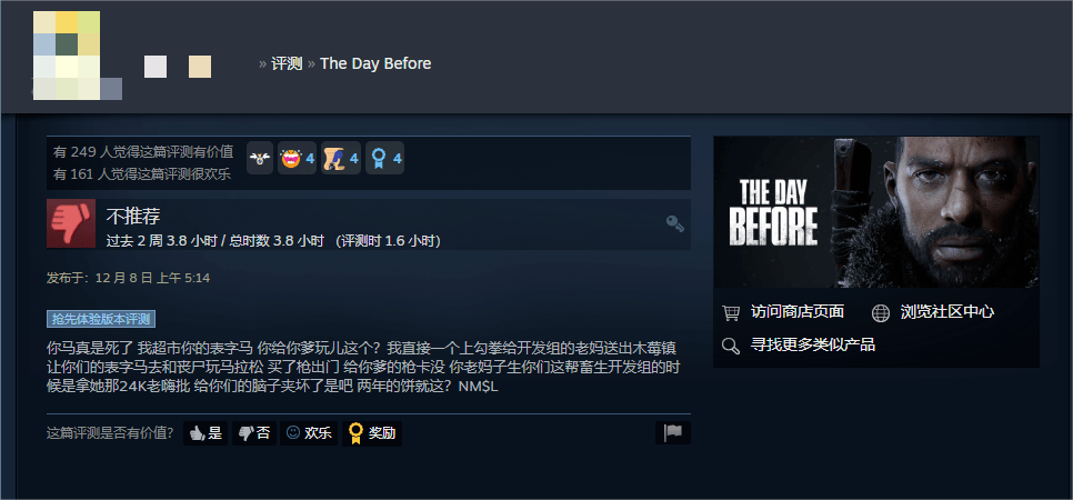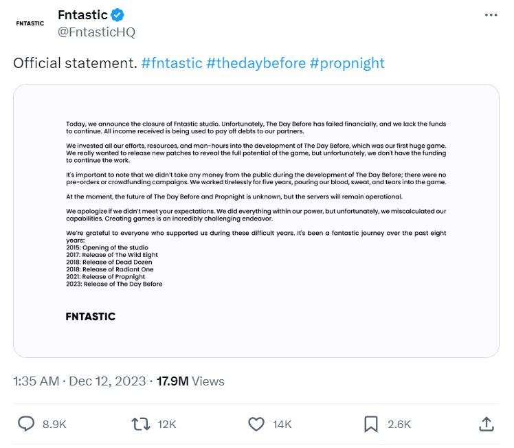 12月12日凌晨,《浩劫前夕》(The Day Before)的开发商Fntastic宣布:虽然他们投入了“所有的精力、资源和人力”来开发游戏,但因为“商业上”的失败,工作室缺乏继续运转的资金,正式宣布破产倒闭。目前,工作室官网也已关闭。截止12日上午,该条推文已经获得了千万浏览量,其热度上升速度堪比前日《GTA6》的推文,但二者在宣发效果上可以说是完全相反:“R星!永远滴神!”和“rnm!退钱!”。