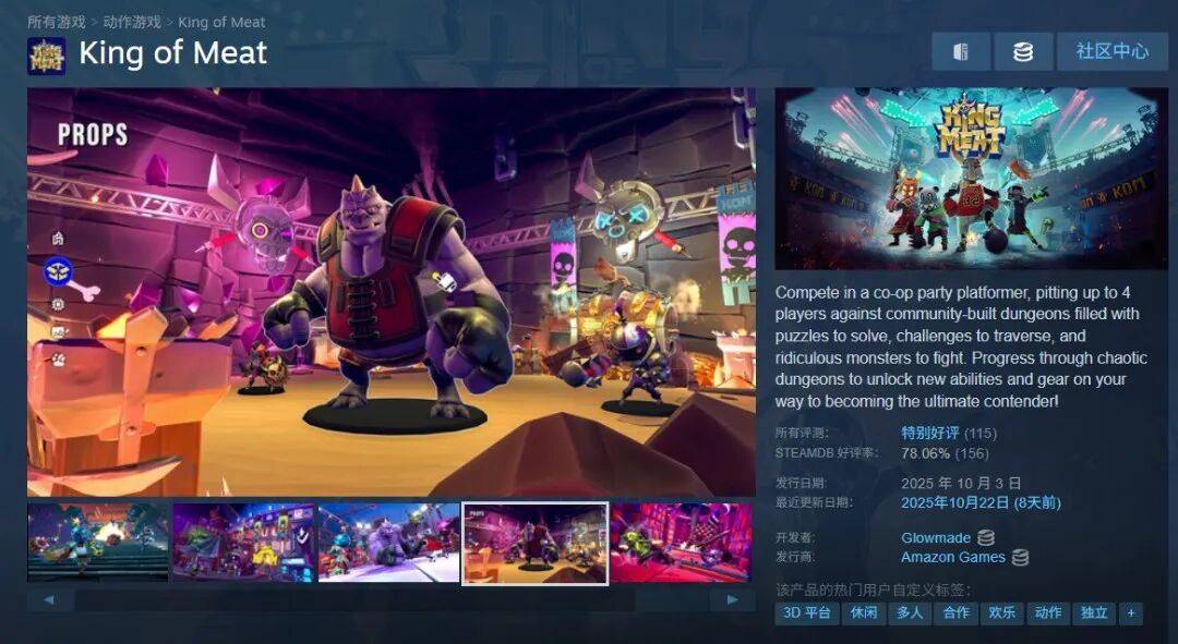 如果把目光放到发行层面,亚马逊游戏的表现同样糟糕:2024年,NCSoft旗下的 MMORPG《天堂永恒》由亚马逊游戏负责欧美地区发行,最终宣告失败;10月初,四人合作平台跳跃游戏《King of Meat》登陆Steam,表现堪称惨淡。