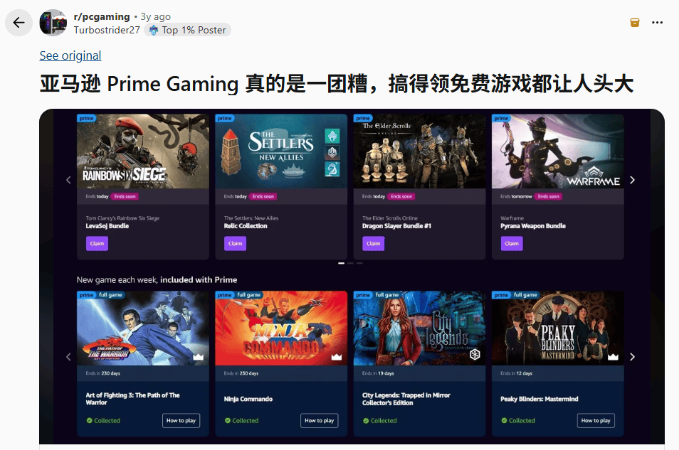 至于Prime Gaming服务,则是免费送游戏都被玩家嫌弃难用: