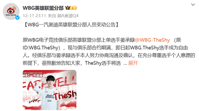 自12月12日结束了LPL冬季转会期以来,最为重磅的一则消息莫过于WBG宣布The Shy离队的消息。虽然在转会期吃瓜过程中,不少网友也是通过一些圈内人士、爆料博主的口中,得知了TS可能会离开WBG的消息,但是哪怕做好心理准备的粉丝以及众多LPL观众,在真正看到俱乐部和选手本人官宣后,仍旧是让人一时间难以接受这个结果。