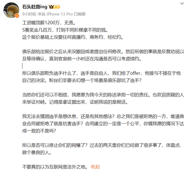 并且WBG老板石头赶路也在文中透露,俱乐部给出这份报价后从未撤回或者修改,直到转会期官宣前一个小时,还在积极和TS本人沟通是否考虑续约。而对于这段时间俱乐部被The Shy粉丝指责、抨击,石头赶路也是感到非常无奈,在文中直言道:“所以俱乐部欺负选手什么了,选手是自由人,我们给了offer,他接与不接在于他自己的决定。粉丝们非要去幻想一个场景是俱乐部坑了选手。”