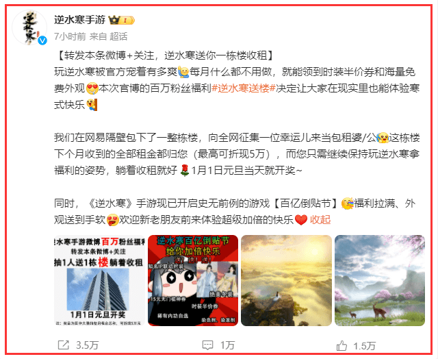 据《逆水寒》手游官方表示,他们直接包了一整栋的大楼,邀请玩家来当“包租婆/公”,一个月的租金直接给!