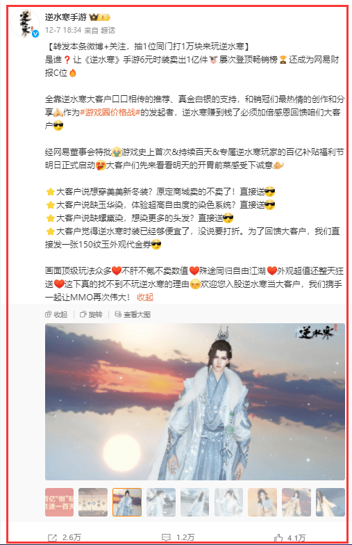然后仗着自己游戏的玩家基数大,打的就是一个“薄利多销”,这不,最近《逆水寒》手游还要在官博表示:自己的6元时装卖出去了一亿份!