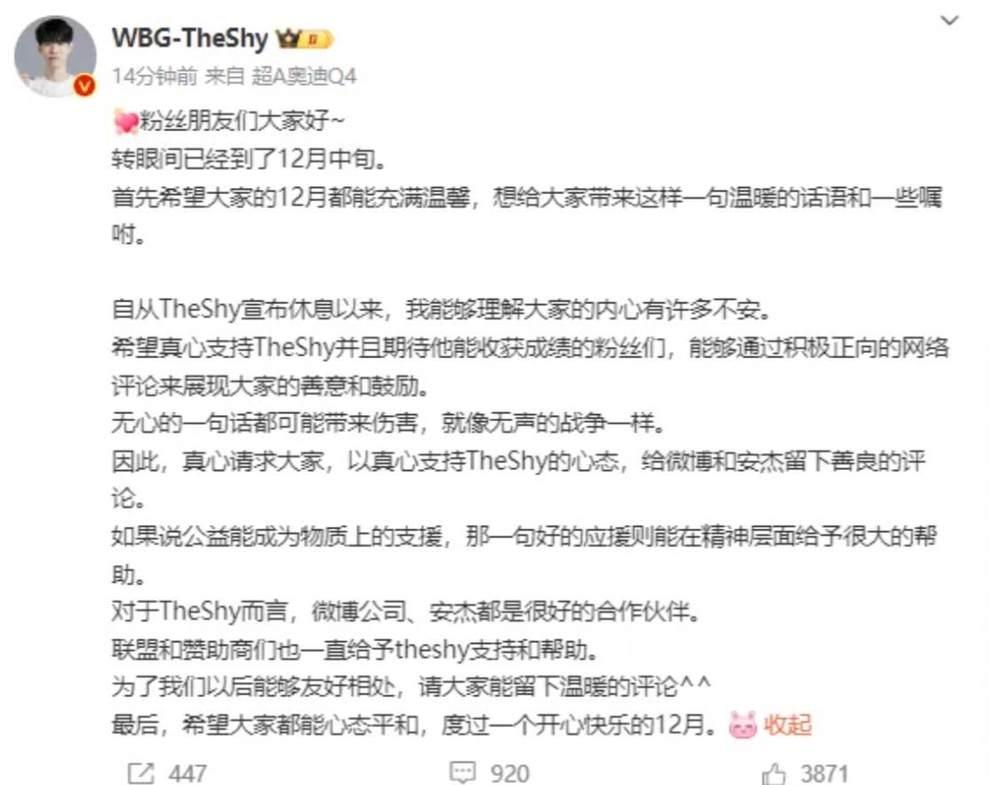 后续WBG多次出面解释但效果不好,结果昨天The Shy也亲自下场了。