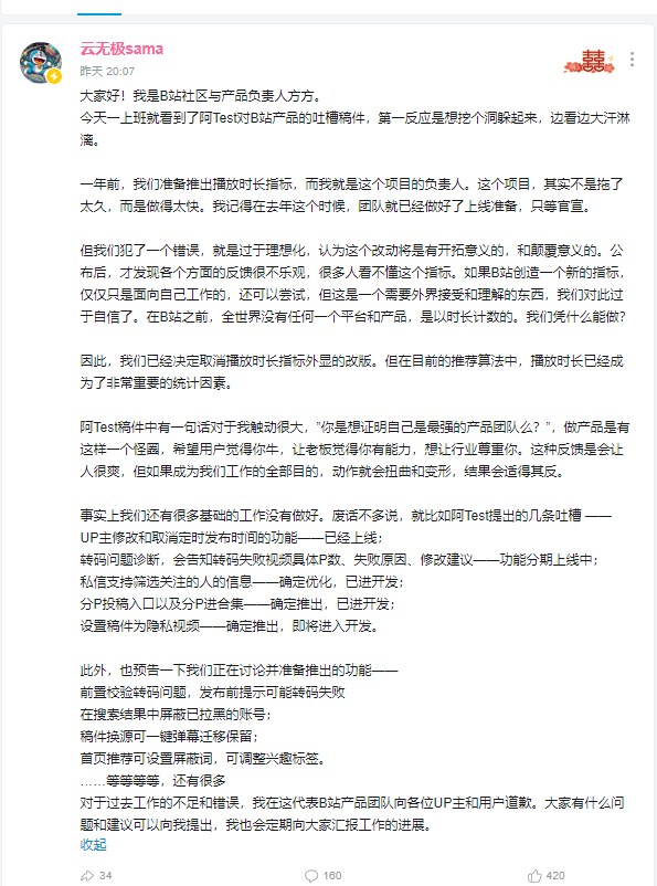 5月22日晚,B站社区与产品负责人方方通过其个人账号发文,回应UP主阿test对B站产品的吐槽,并代表B站产品团队向各位UP主和用户道歉。对于此前推出的播放时长指标,方方表示,团队已经决定取消播放时长指标外显的改版,称其过于理想化和自信,没有考虑到外界的接受和理解程度。但他强调,在目前的推荐算法中,播放时长已经成为了非常重要的统计因素。