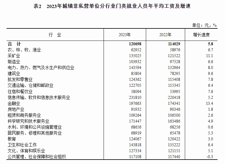 2023年全国城镇非私营单位就业人员年平均工资为120698元,比上年增加6669元,名义增长5.8%,扣除价格因素实际增长5.5%。