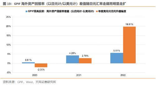 本轮美联储收紧所带来的美日货币立场分化与日元贬值,使得拥有大量海外资产的GPIF过去两年的利润超过了前二十年的总和。以另类投资为例,2020-2022年,随着日元相对美元进一步贬值,海外资产以日元计价和以美元计价的回报率差值大幅走扩。