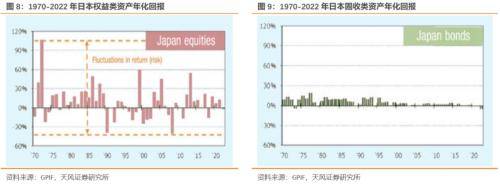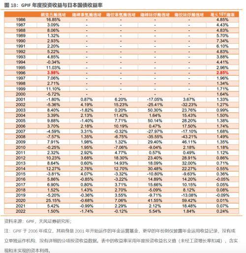 从数据上观察,2000年以前伴随日本10年国债收益率持续走低跌破2.5%,养老年金的收益也呈现下滑趋势;当2000年后日本十年国债在2%附近时,GPIF国内债券投资年度回报在2-3%左右;当2012年后日本债市利率进一步走低,GPIF的国内债券投资收益也明显受到影响,基本不超过1%、甚至大多数年份为负。