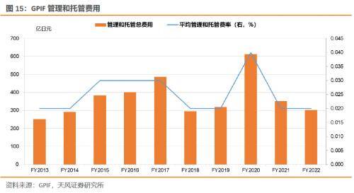 但考虑到一是国内债券占比总体趋势下滑,二是该资产类别的托管成本并未明显增加,因此总体上GPIF投资组合依然有较明显的被动投资特征。伴随被动投资占比上升,GPIF所支付的管理和托管费用下降,间接增厚了收益。