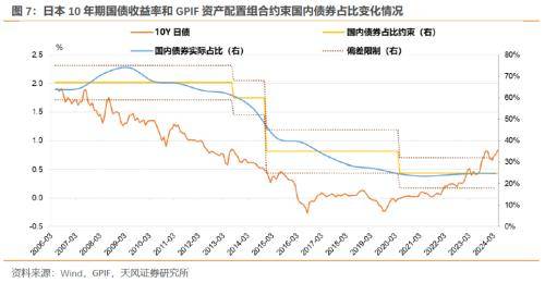 2006年GPIF配置国内债券的比例是67%(上下浮动8 pct),彼时日本基本面好转,为货币政策收紧创造了条件,国债利率显著上行。但2013年后日央行推出量化质化宽松(QQE),此后短端利率维持0附近、长端利率开始向0靠拢,GPIF的国内债券配置基准不断下行,中位水平依次逐步降至60%、35%、25%。