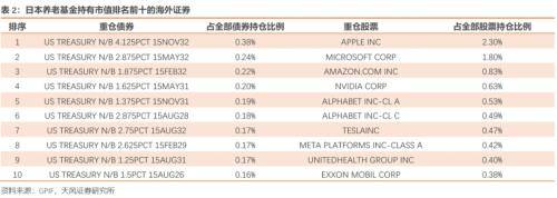 GPIF在海外配置上尤其青睐美国国债和美国科技股。其资产组合中,所持有的市值排名前十的海外债券均为美国国债;市值排名前十的海外股票则多为苹果、微软、亚马逊、英伟达、谷歌等美股科技巨头。