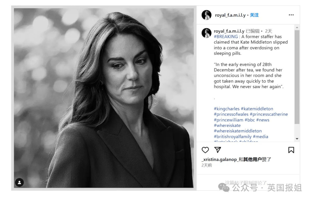 有王室相关的社交媒体号声称,一名王室前工作人员目击到去年12月28日傍晚“有人”服用了过量安眠药。