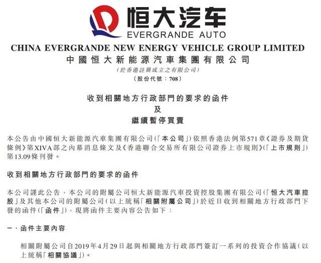 恒大汽车在公告中表示,子公司计划与地方政府部门进行沟通协调,以解决此事宜。同时,公司警告称,如果地方政府部门的要求最终得以执行,可能会对恒大汽车及其子公司的财务状况和业务运营产生严重的负面影响。