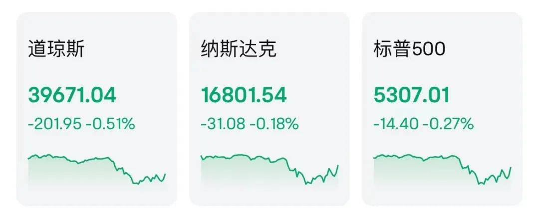 截至收盘,道琼斯工业指数跌0.51%,报39671.04点;标普500指数跌0.27%,报5307.01点;纳斯达克指数跌0.18%,报16801.54点。