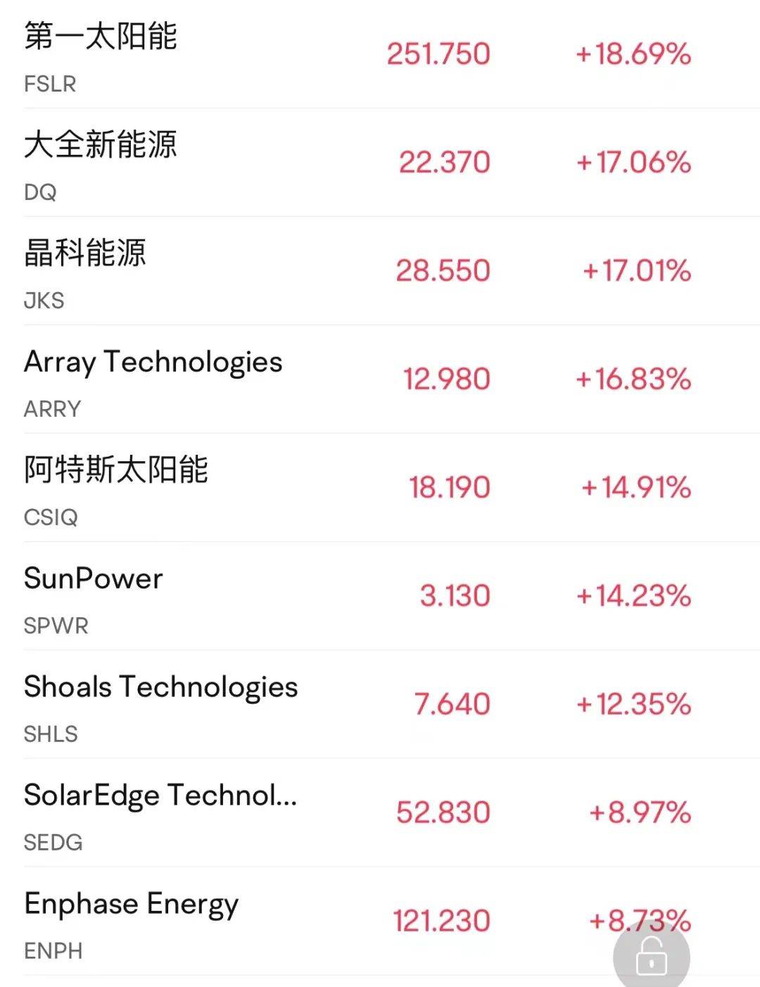 美股光伏板块大爆发!第一太阳能(First Solar)大涨18.69%,多数光伏股涨幅超10%。