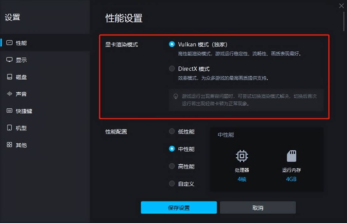 大部分用户将性能设置为“中”即为合适配置,可流畅运行绝大部分游戏,配置较差的玩家,自定义不低于“2核/2G”,如果游戏包过大或者游戏画质要求高,则不低于“4核/3G”。 (注:这里不是设置得越高越好,CPU核数最高不得超过电脑核数的一半,否则会产生卡顿。)