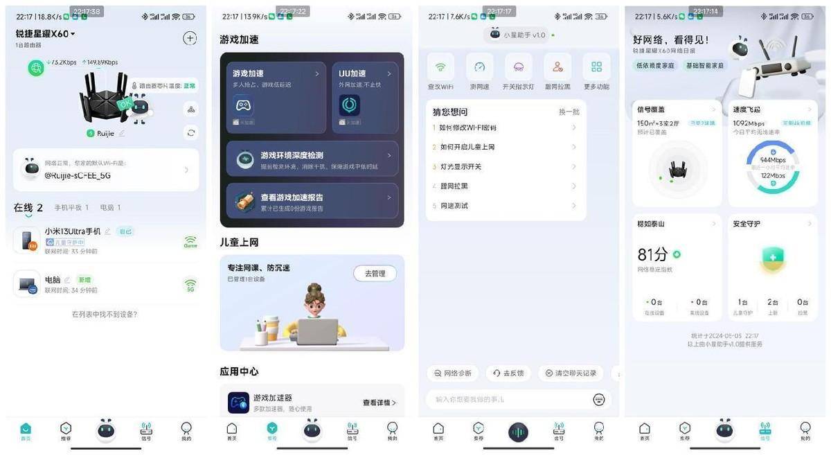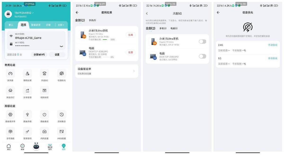 这里给大家截了几张相关配置图片,我们可以通过锐捷星耀家APP对联网设备进行WIFI名称和密码配置、网速限制、信道优化、5G网络等配置。需要给家特别说一下,无线网络中内置了一个智能家居网络,家里面如果有智能家电,可以使用这个WIFI信号,保证设备长期稳定在线,这一点需要好评。