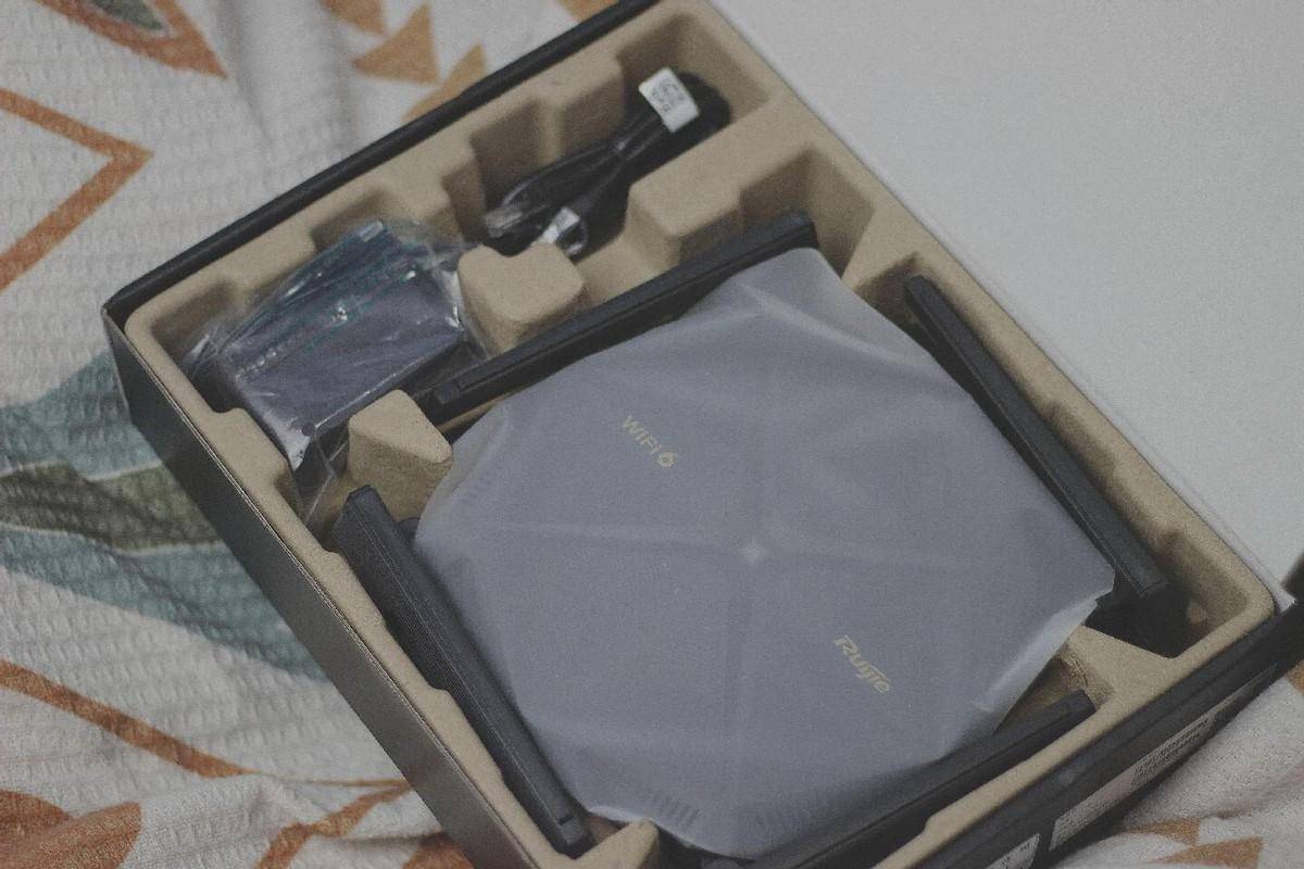 锐捷天蝎X60 new 电竞路由器打开包装盒,路由器主体,还有千兆网线、电源适配器等。