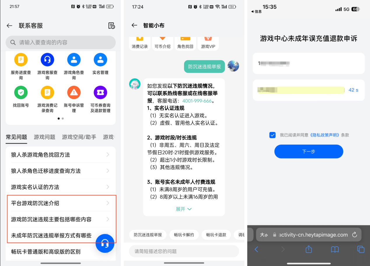 在生活中,如果发生未成年人游戏误充值的情况,家长们无需过分焦虑。广东欢太科技有限公司设立专属绿色通道,帮助家长快速沟通,协商误充值退款。家长也可以选择线上拨打客服电话或24小时在线客服服务进行咨询和反馈。 另外,广东欢太科技有限公司还搭建了自助反馈页面,便于家长提单,并由客服人员全程跟进,提升退款效率。对于未成年人在游戏期间可能遇到的更多问题,如防沉迷违规、未成年人欺凌、行为不当和游戏违规等,广东欢太科技公司同样予以高度重视,搭建了未成年人专属投诉入口,用户可快捷进行举报。