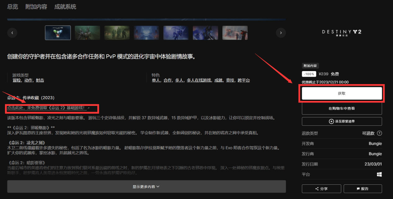 (注意,如果你之前没买过《命运2》基础版,需要先点击图示左侧位置获取基础版。)