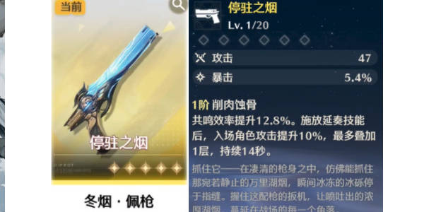 这里推荐各位漂泊者选择带有暴击词条的武器「冬烟·迅刀」:千古洑流和「冬烟·佩枪」:停驻之烟。