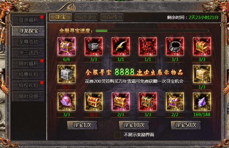 寻龙探宝每轮共有2888次机会,其中蕴含着许多不为人知的规律。每周的寻龙活动中,各种宝物的出现位置都是固定的,但位置会随着每周的更新而变化。对于稀缺的宝物,如战魂和至尊随机箱,我们需要准确找到它们的位置。而对于数量较多的宝物,它们的出现位置则遵循一定的规律:首次出现位置的倍数。例如,如果霸主圣晶首次在第136次寻龙中出现,那么下一次出现就是在136*2=272次,后续的位置也依此类推。