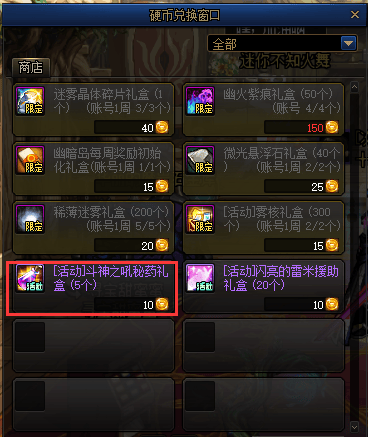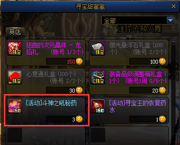 其次则是活动商店兑换,由于商店中需要使用翻牌获取的硬币,经计算每周两张宝藏图可获取到345个硬币,除去周兑换道具后,剩余可兑换出约80个斗神药剂。